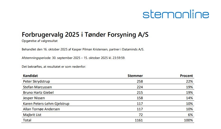 Forbrugervalget 2025 i Tønder Forsyning A/S er nu afsluttet, og vi vil gerne starte med at sige en stor tak til alle jer, der har taget jer tid til at stemme. Jeres engagement er med til at styrke den demokratiske forankring i vores arbejde. I alt blev der afgivet 1.161 stemmer.